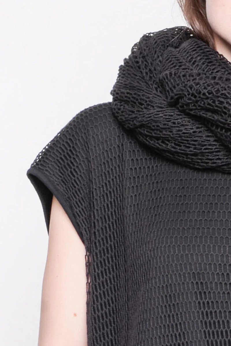 This versatile top is a must-have for any wardrobe! The unique 2-layer design adds depth and texture to your outfit, while the soft inner lining ensures a comfortable fit all day long. The rib jersey finishing at the bottom creates a flattering shape, and the cotton tape detail at the neckline and armholes adds a touch of elegance. Handcrafted in Portugal using high-quality materials such as mesh and cotton, this top is a true work of art. Don't miss out on this one-of-a-kind piece that can be dressed up or down to suit any occasion!
