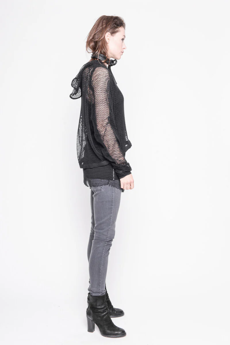 This Mesh hoody top is a unique and versatile piece that can elevate any outfit. Made from 100% cotton mesh, it is lightweight and breathable, perfect for layering. The hoody neckline adds a trendy touch while the jersey rib finishing on the cuffs and bottom provide a comfortable fit. Handmade in Portugal with care, this top is a must-have for any fashion-forward wardrobe. Get yours now and stand out from the crowd!