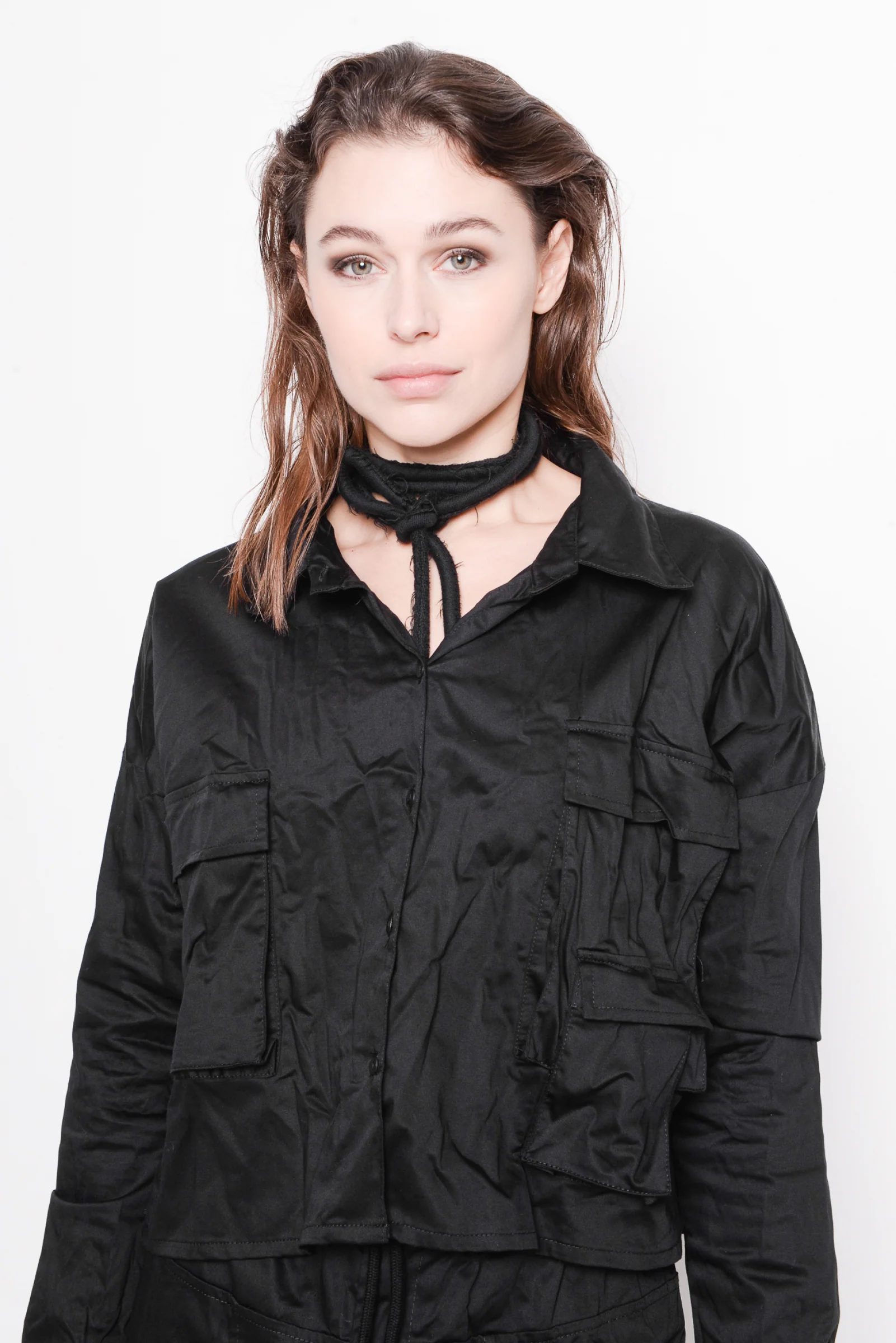 This refined black blouse is crafted from a premium blend of 97% cotton and 3% elastane poplin, tailored to a waist-length silhouette with long sleeves, a button-closure and multiple asymmetrically-distributed cargo pockets. Effortlessly stylish and supremely comfortable, it's the perfect addition to any luxury wardrobe.