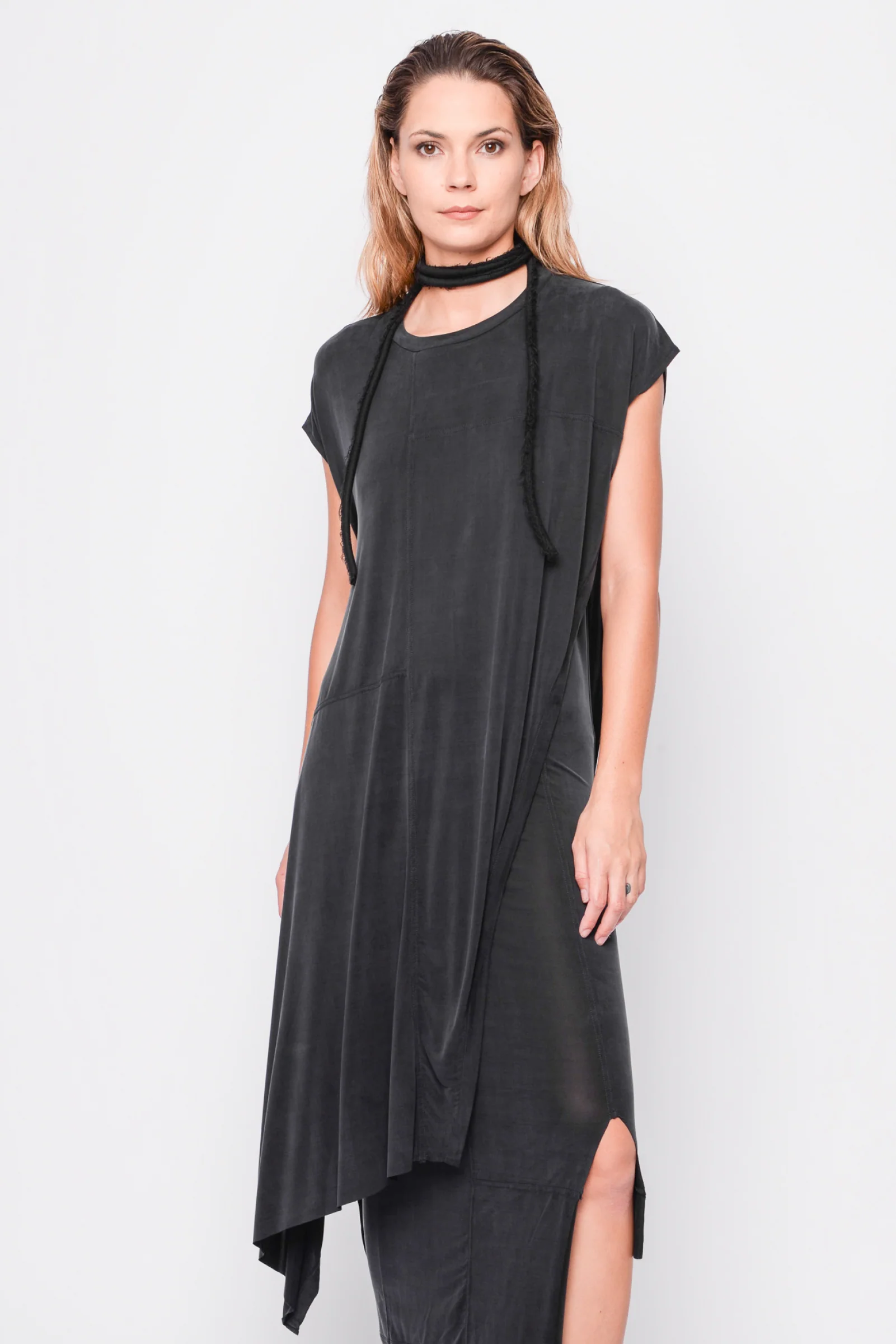 This elegant two-in-one garment, crafted from sumptuous cupro, feels feather-light against the skin. Combining top and dress, it features an asymmetrical split and artistic felted seams for a mesmerizing look.