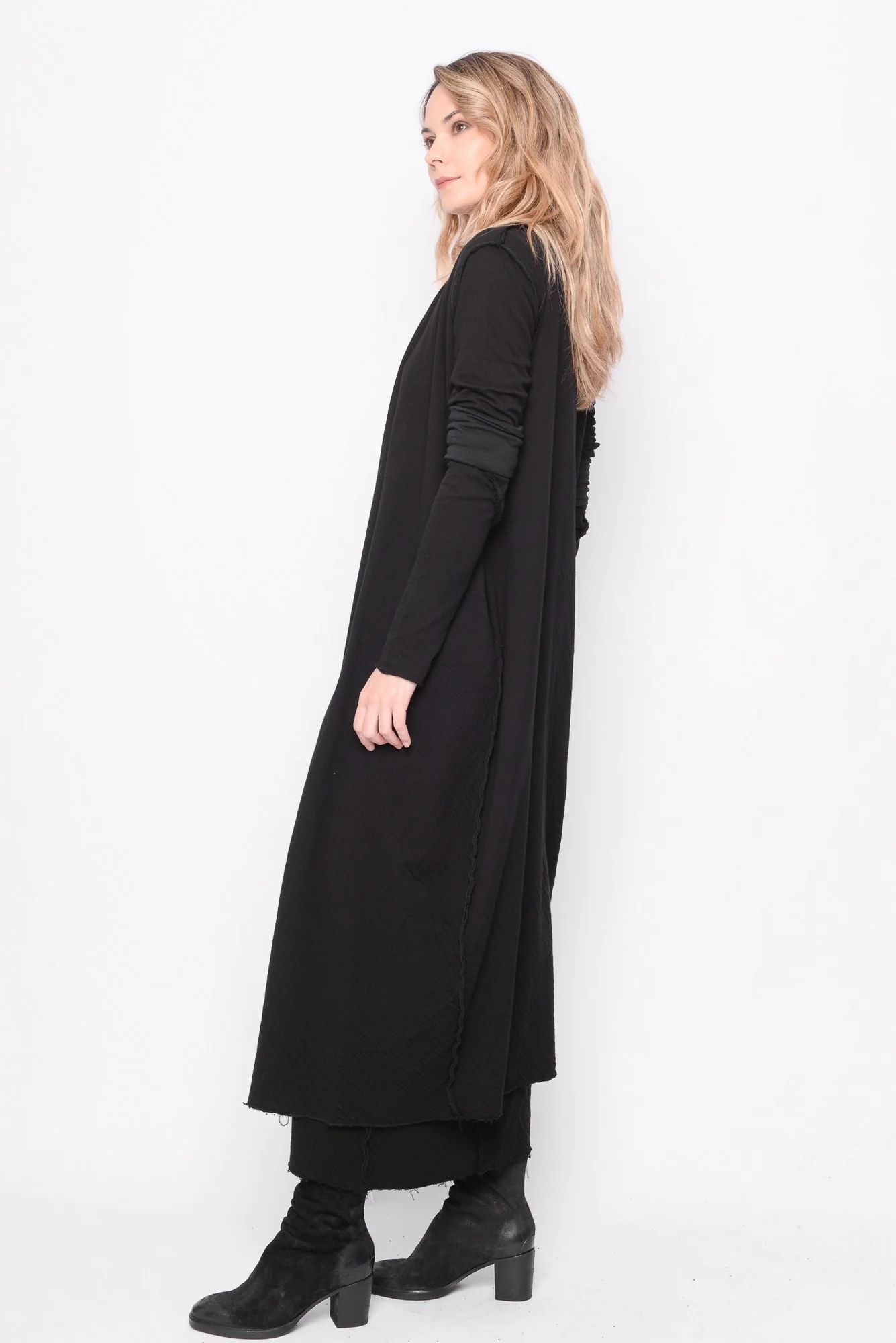 A cardigan at ankle length with two side pockets and raw edge finishing details. The cardigan that symbolizes the modern elegance BLACK by K&M stands for.