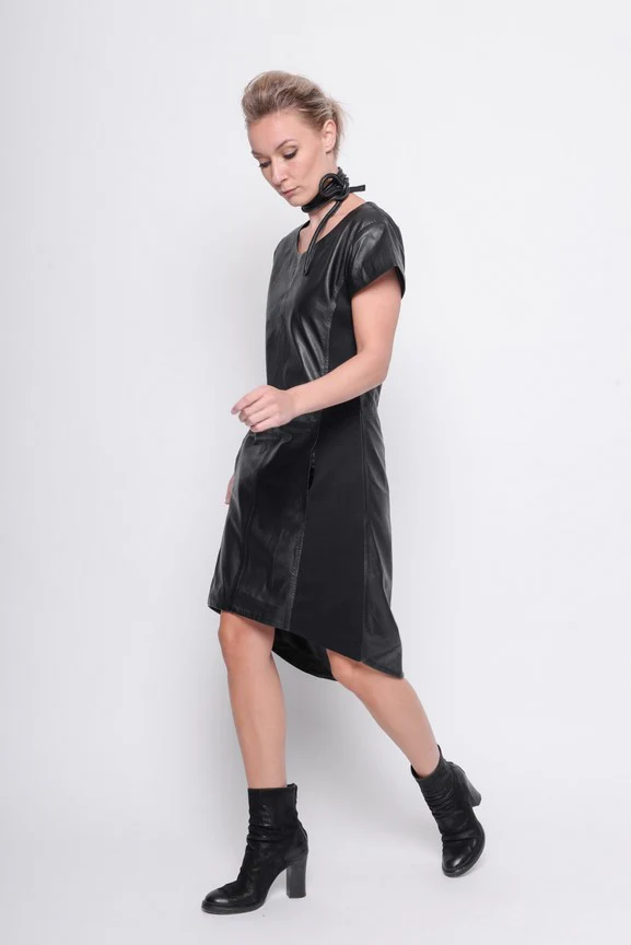 This luxurious leather tunic features elastic rib side panels, a sleeveless silhouette, and a knee-length cut. An asymmetrical zipper completes the look on the front, making it the ultimate statement piece.
