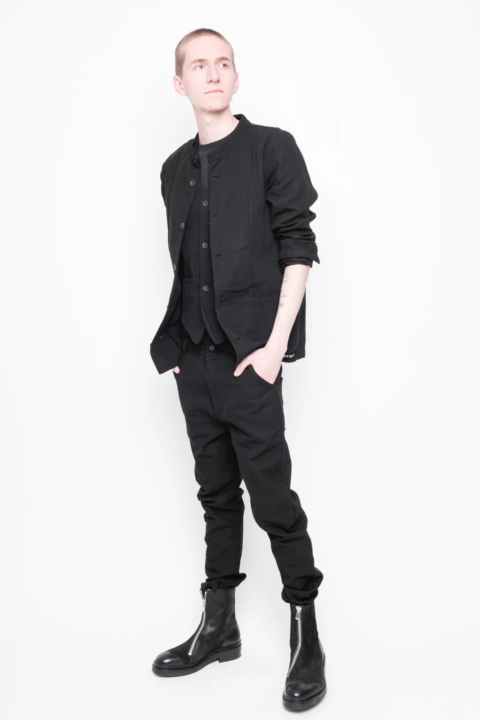 a classic uniform jacket with a round collar and dart cuts, available in both black and cold-dye grey, made from sturdy washed canvas that's 100% cotton, is a practical and stylish option for any wardrobe. It can be worn casually or formally, making it versatile and easy to pair with a range of outfits. The edgy look of the washed canvas material adds character and durability to the jacket, making it a great addition to any wardrobe.