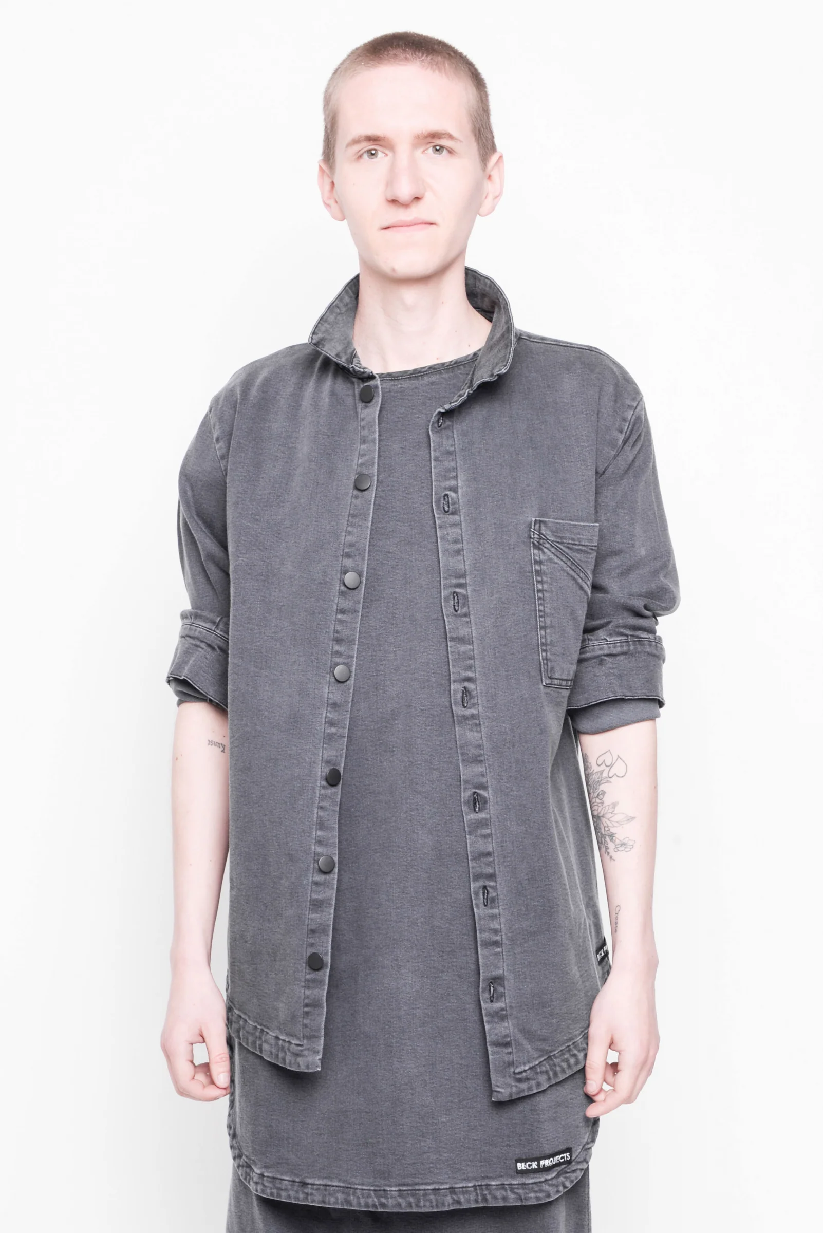 Introducing our classic big-shirt for men, made from a durable and comfortable denim twill that consists of 85% cotton, 14% polyester, and 1% elastane. This shirt is available in two color options, faded grey and black.
