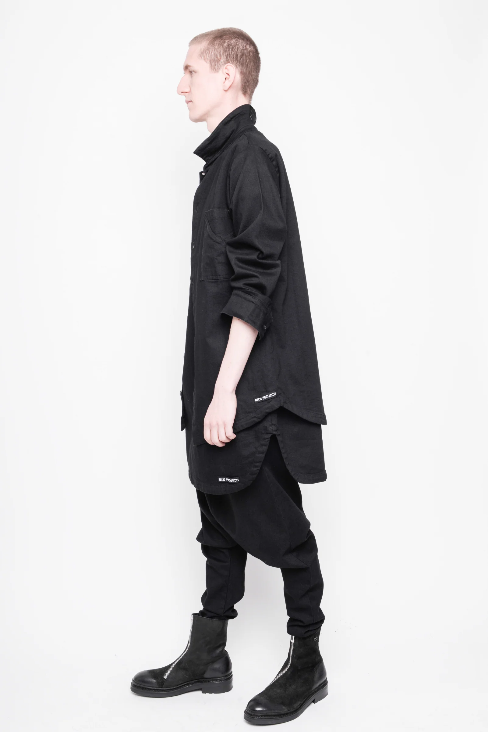 The shirt is designed to be versatile and can be worn as a blouse or overshirt. It has one chest pocket with jeans pocket detailing and is fastened with jeans buttons. The shirt comes in two colors: faded grey and black.