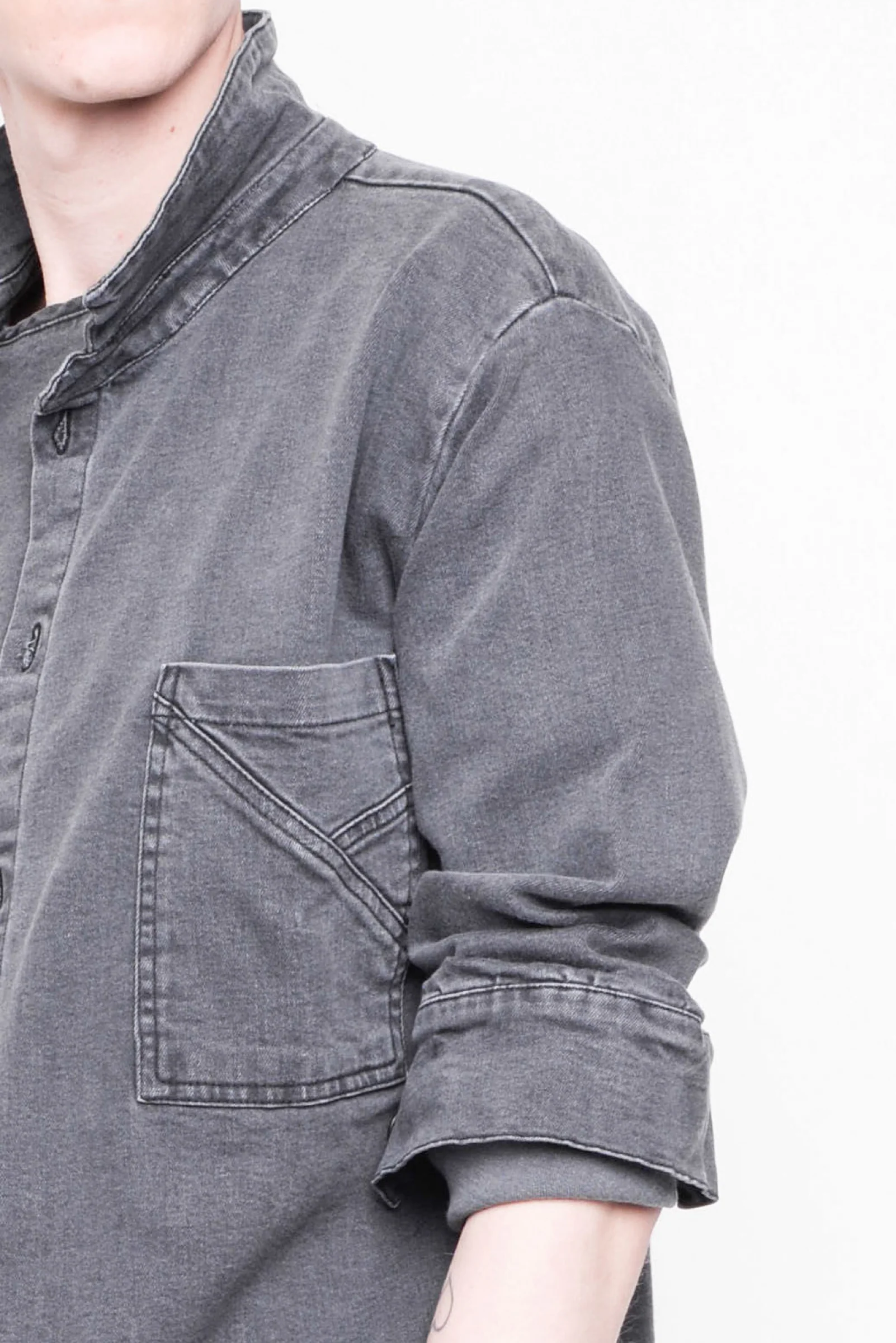 The shirt is designed to be versatile and can be worn as a blouse or overshirt. It has one chest pocket with jeans pocket detailing and is fastened with jeans buttons. The shirt comes in two colors: faded grey and black.
