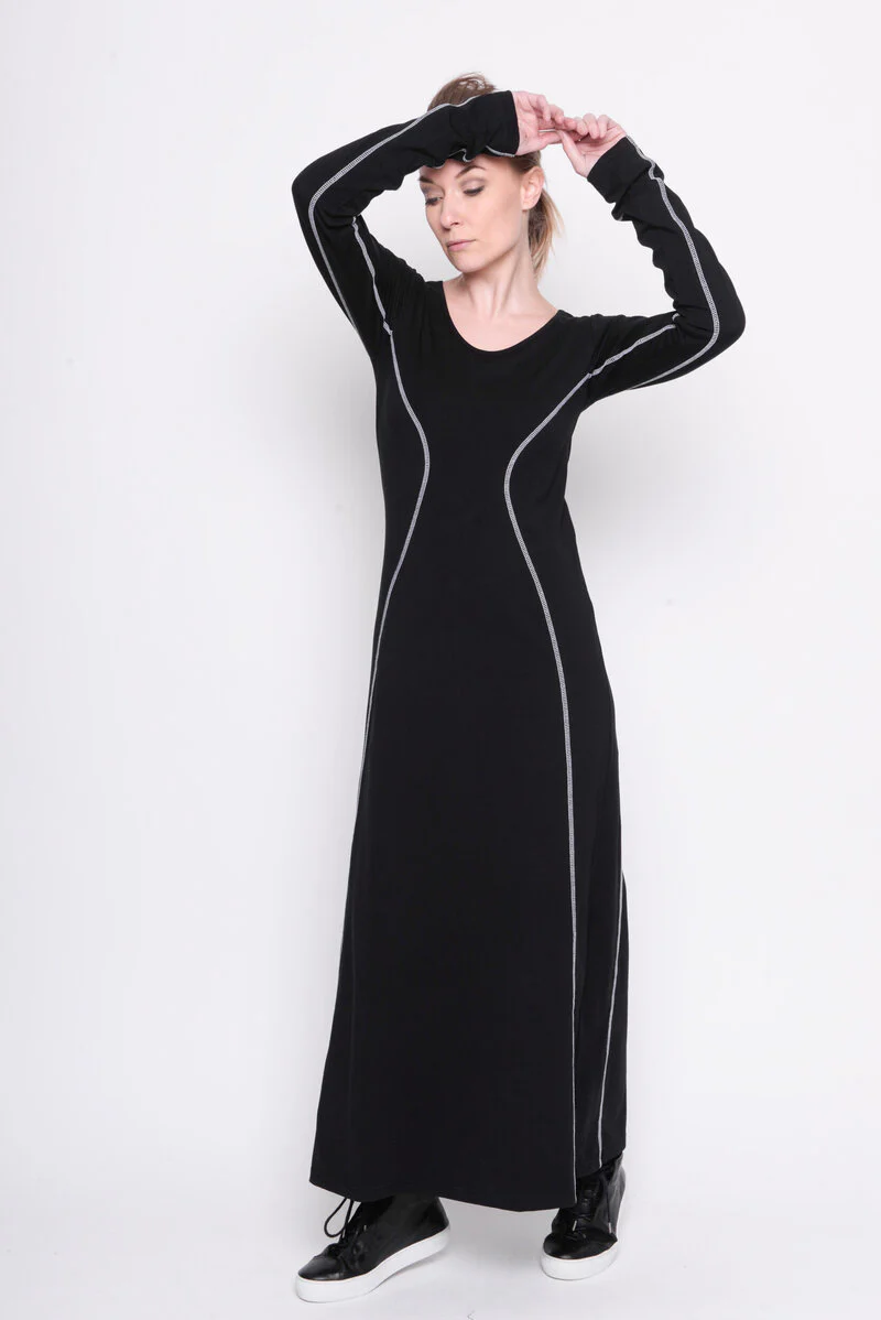 Ankle length tight fit dress with wide round neckline, long sleeves and white detail stitching A modern classic. Its slim silhouette and eye-catching white stitch detailing offers a sophisticated but sporty look.