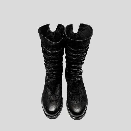 Eske is a backzip boot with wrinkles on bootleg - lining is smooth and shaped. Crafted on a Goodyear welted rubber sole.