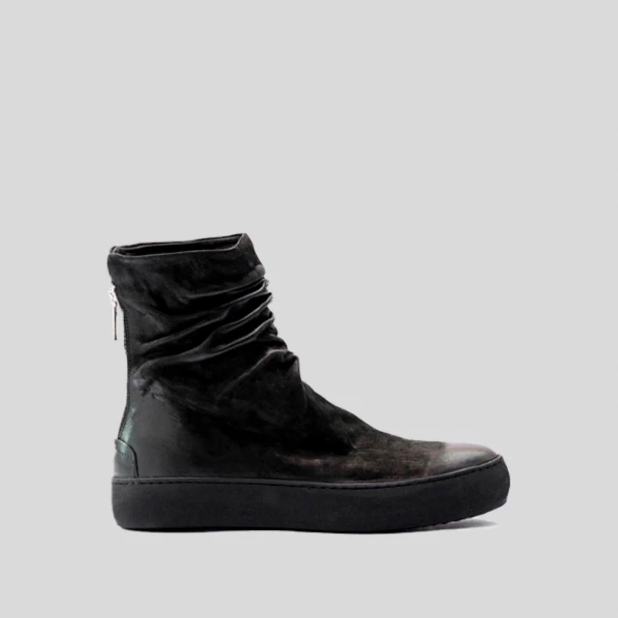 A back-zip sneaker boot with a strong Excella metal zip. The wrinkled surface creates a bold look. Crafted in horse leather on the TLC cup sole.