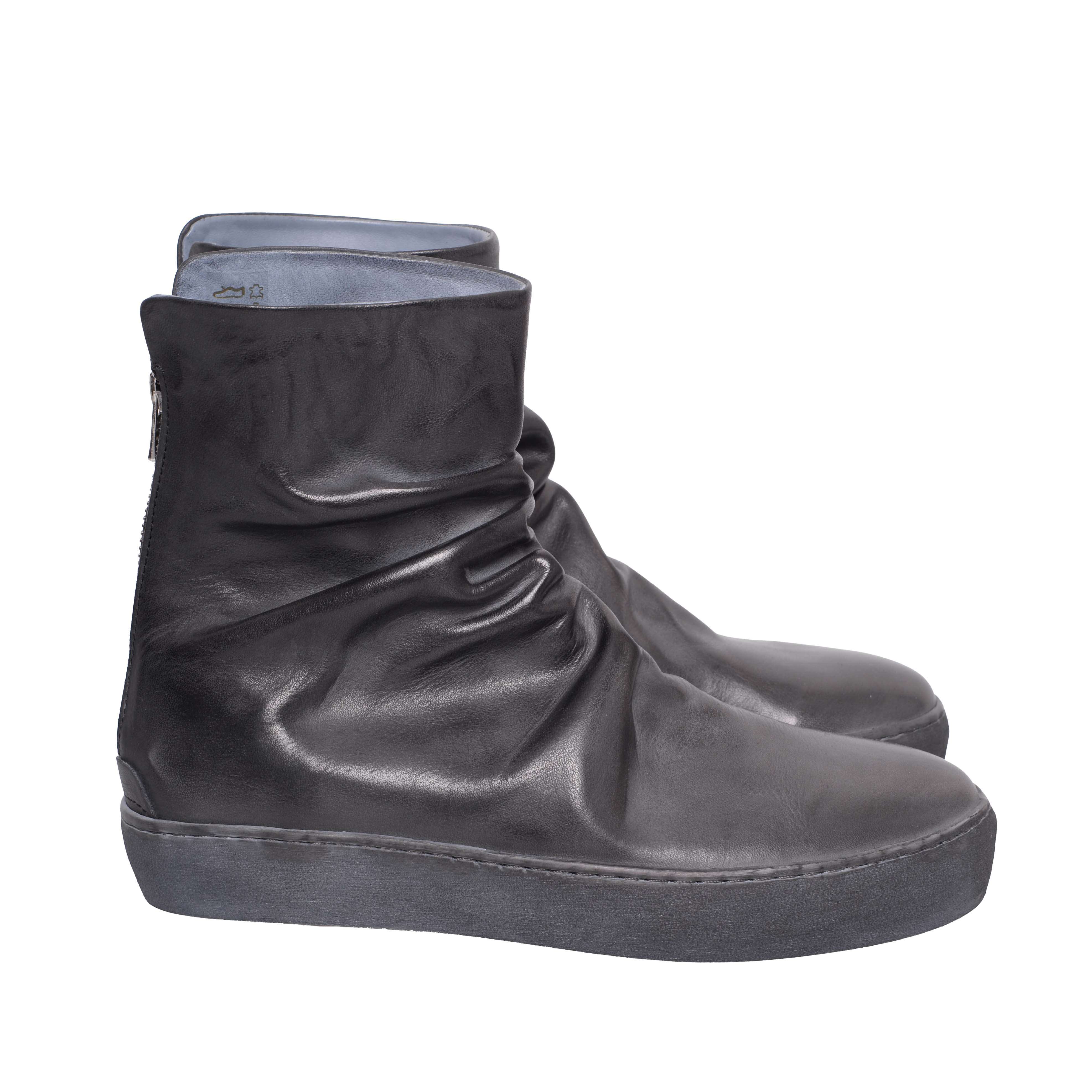 FINN is a back-zip sneaker boot with a strong metal Excella zip. Has perfect wrinkles on the outside - the lining is smooth and shaped. Crafted in horse leather on our TLC cup sole.