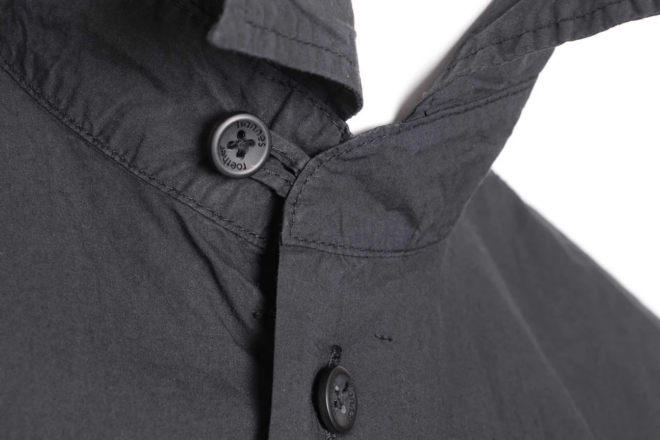 This black tailored shirt, crafted from 100% cotton and boasting asymmetric collar button detailing and the signature HANNES ROETHER back detail, exudes luxury and sophistication.