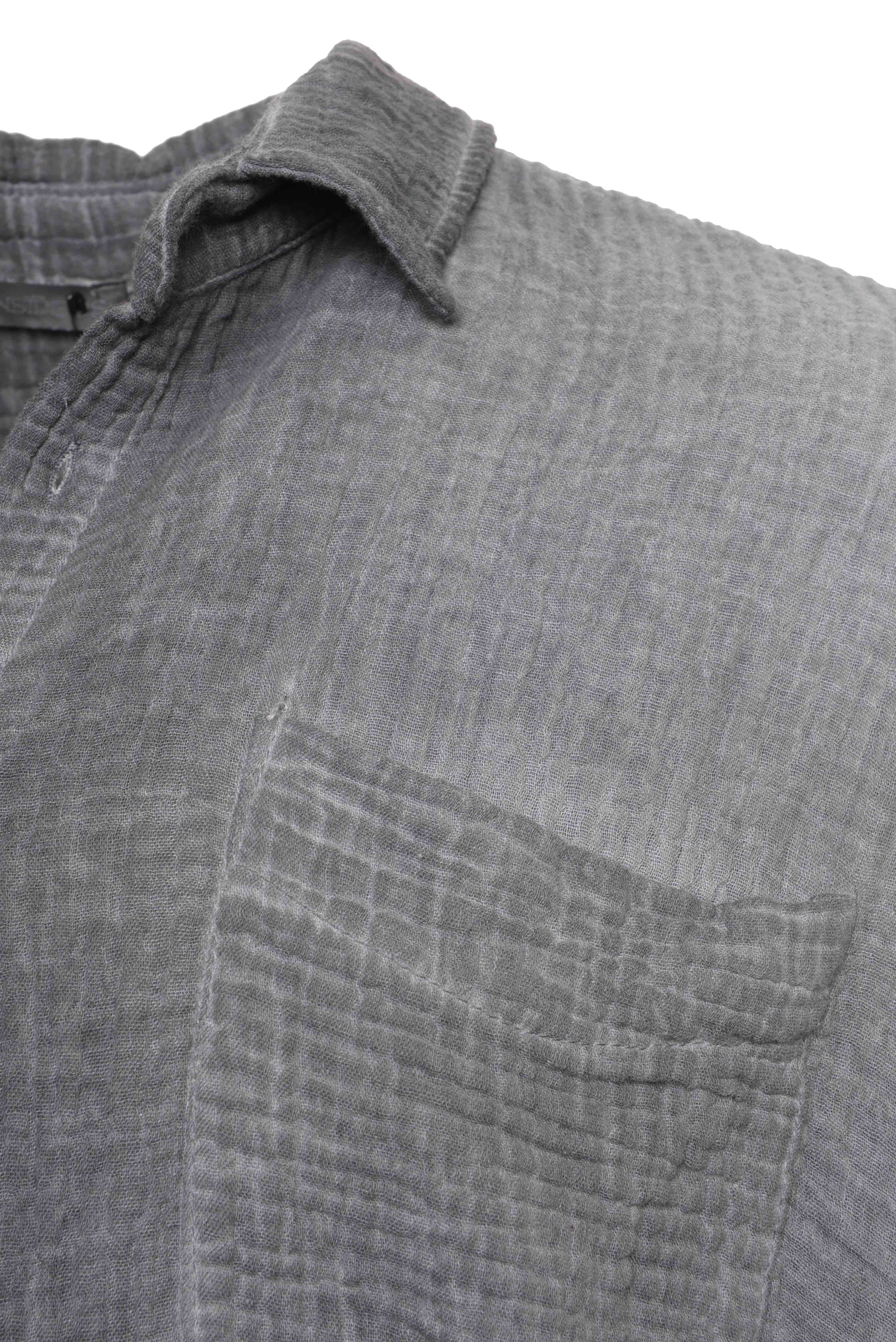 This oversized half length sleeved shirt from La Haine is made from a 100% cotton waffle fabric, made in Italy. The fabric is cold dyed, that gives the shirt a rough texture. Frontside pocket. And a longer fit. Airy and perfect for warmer days. Or wear loose over a simple long sleeve shirt.