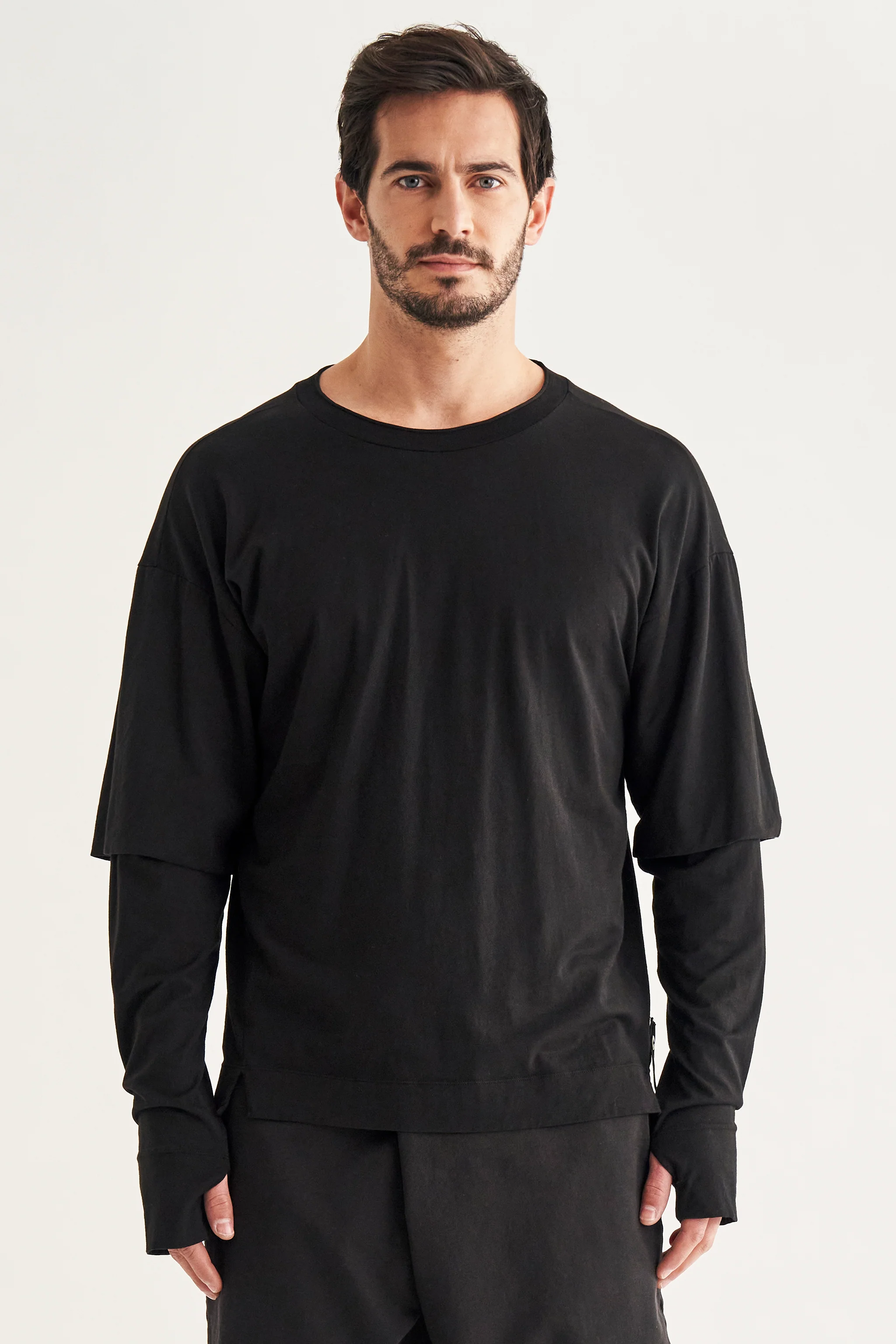 Oversized T-shirt in garment dyed cotton jersey. Knitted collar, double sleeve motif, front vents, elongated cuffs with thumb holes, detachable label on the side.