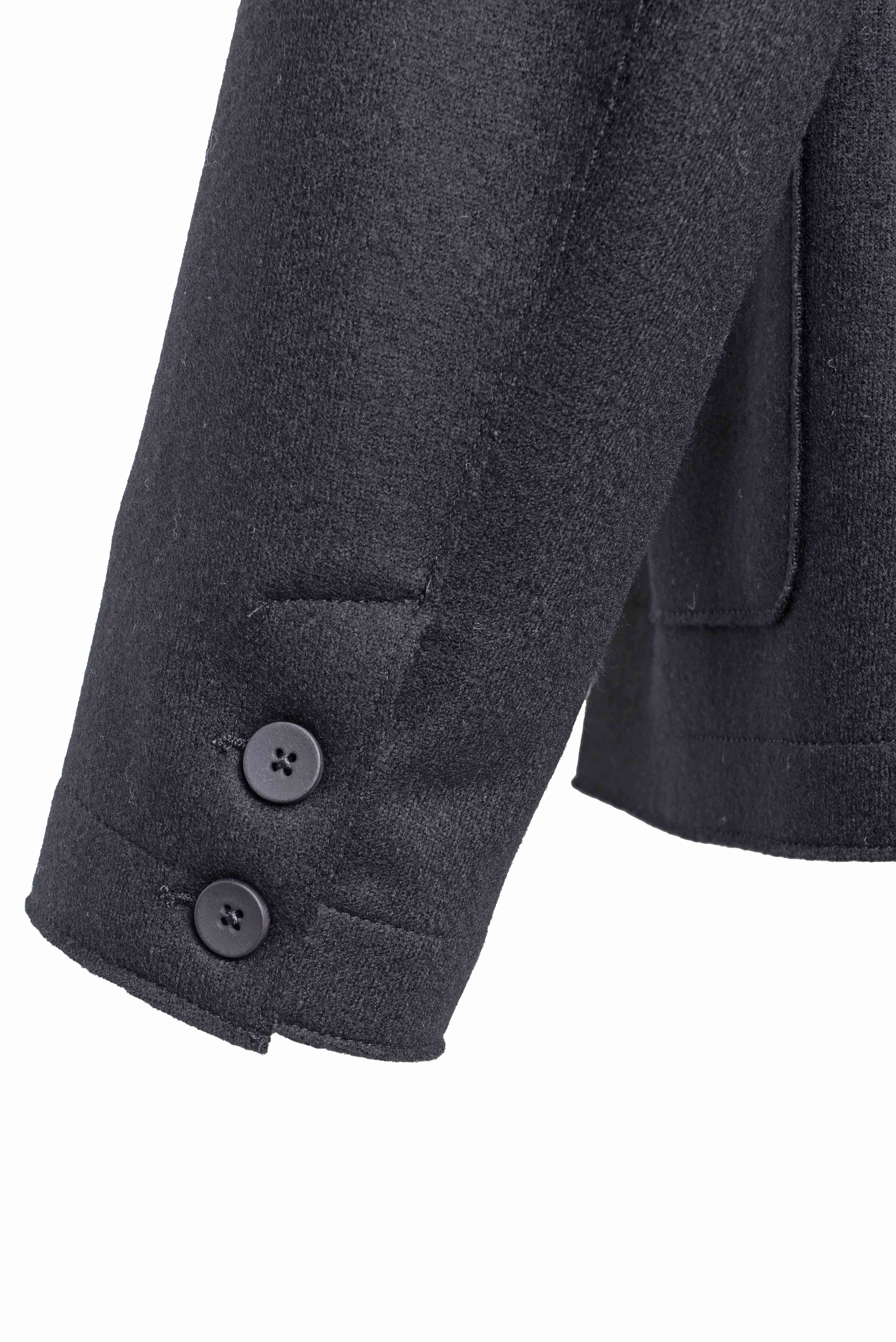Regular-fit blazer in raw cut virgin wool cloth, narrow lapel collar, patch pockets, central vent on the back, unlined.