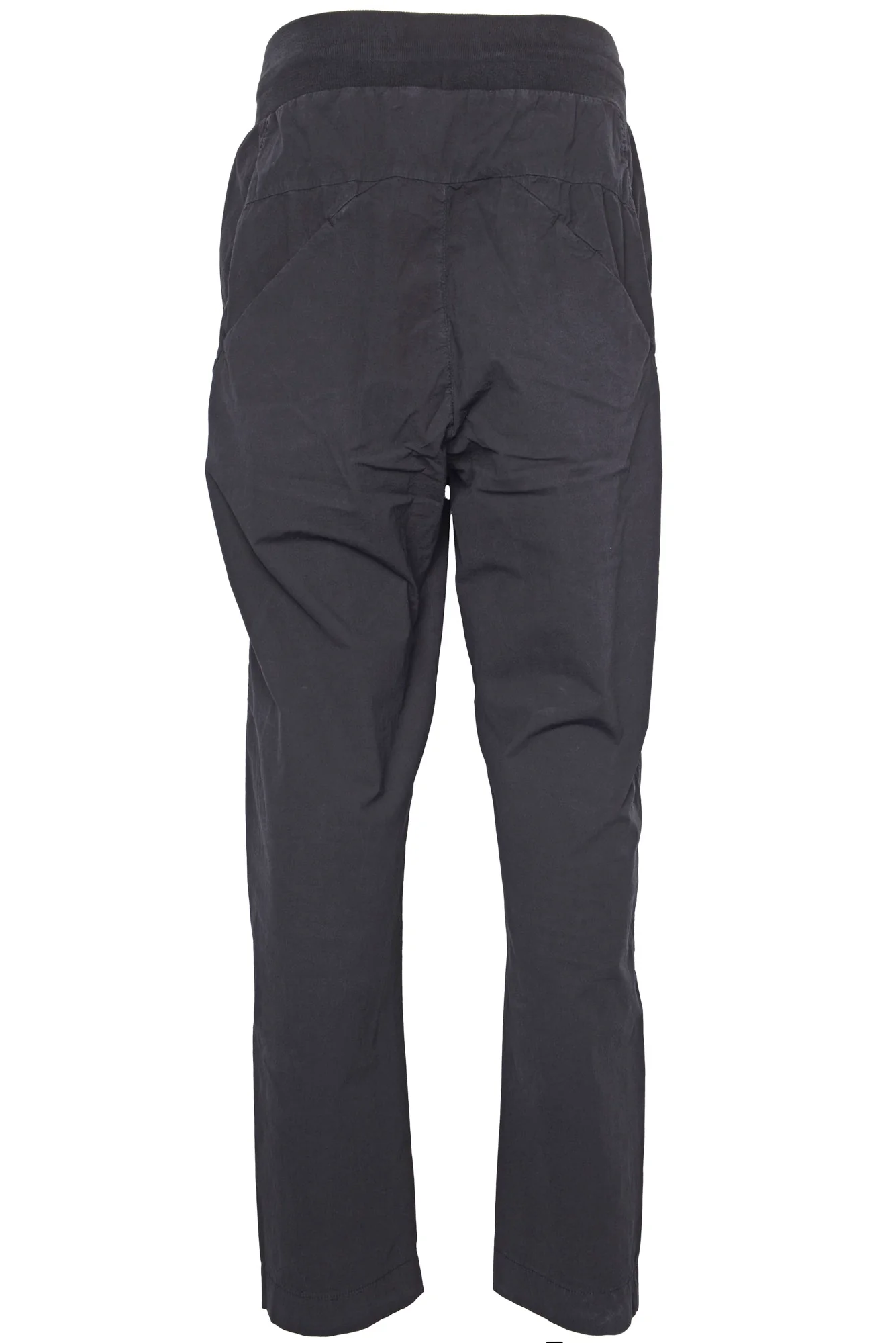 Transit pant made from loose-fit stretch elastane and cotton crêpe jogging bottoms. Knitted waistband and drawstring. Slant front pockets. Mock button fly. Slanting back pockets in line with the cuts.